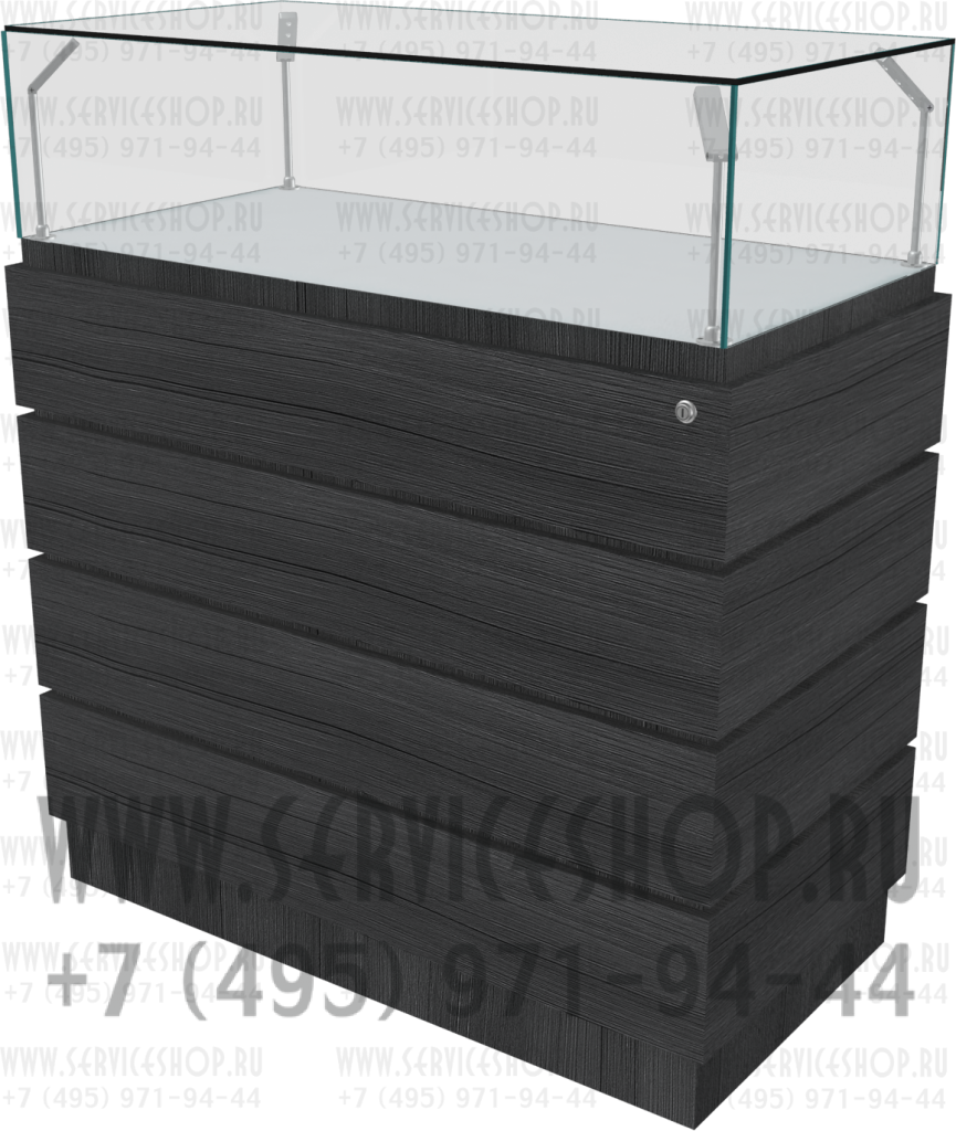 Демонстрационная прямоугольная витрина изготавливается из плит МДФ в сочетание с плитой ДСП с отделкой пластиком HPL. Стеклянная часть изготавливается из стекла толщиной 8мм. с ультрафиолетовой склейкой.