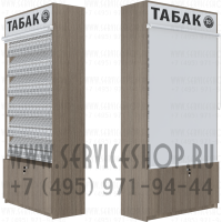 Витрина под сигареты с четырьмя полками на гравитации с тумбой накопителем без регулировок по ширине сигаретных ячеек, производится из ЛДСП плиты, торцевые кромки пвх в цвет корпуса, полки из металлического прутка с окраской порошком. Гравитационная полка устроена так, что сигаретные упаковки под собственной нагрузкой продвигаются вперёд, у такой полки нет пружин и направлявших, которые часто выходят из строя и являются одним из слабых моментов при эксплуатации. Чтобы соблюсти закон и соответствовать федеральному закону от 23 февраля 2013 г. N 15 витрина комплектуется рулонной шторкой с ручным управлением.