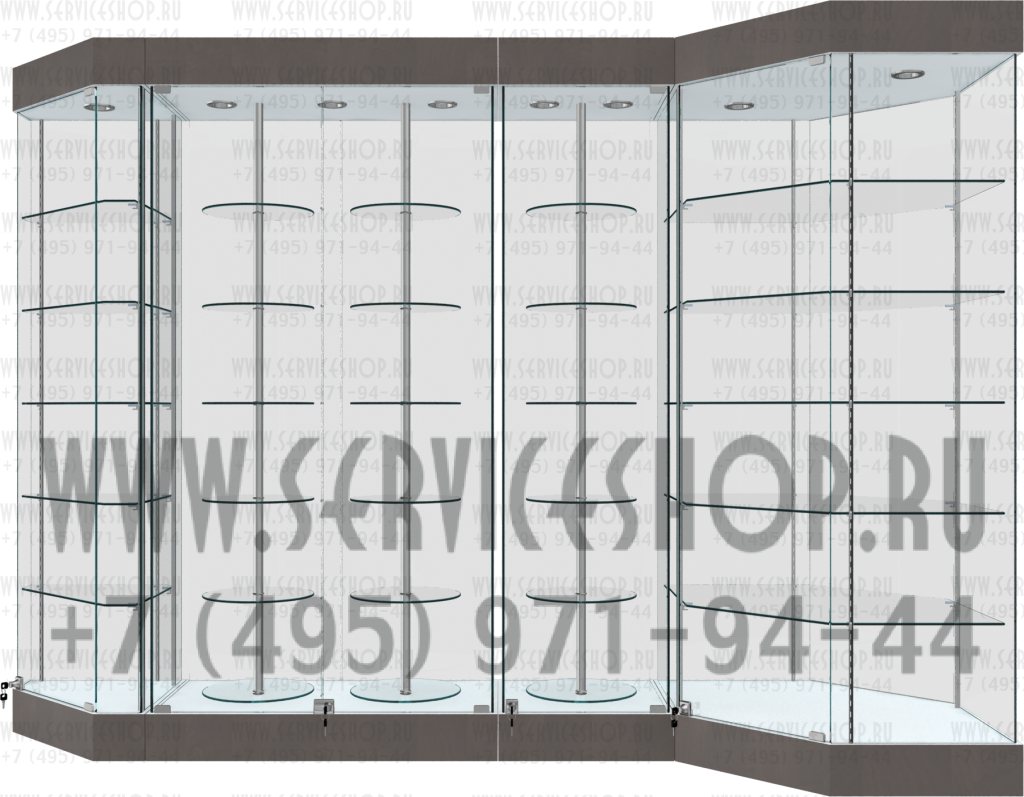 Витрина прямоугольная со стеклянными крутящимися полками коллекция Кёльн модель В-9 изготавливается из стекла толщиной 6мм. марка М1 все видимые торцы отполированы под три грани(евро кромка) все полки регулируются по вертикали. Нижняя и верхняя часть изготавливается из плиты ЛДСП в сочетании с плитой мдф. Витрина поставляется в полусобранном виде , нижние и верхние части в собранном виде, боковые и задние стекла, стеклянные полки поставляются в упакованном виде. В стандартной комплектации витрина поставляется с верхней подсветкой, замками, фурнитурой для регулировки полок по высоте, вращающимися круглыми стеклянными полками, ножками с возможностью регулировки.
