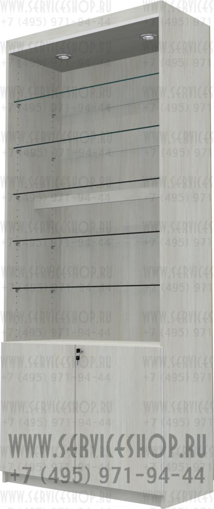 Витрина со стеклянными полками без стеклянных дверей с накопителем в нижней части, задняя стенка ДВП. Прозрачная передняя часть, в витрине 5 полок из стекла. Толщина стекла 5 мм, обработка края стекла полировка (евро кромка). Большой выбор расцветок. Двери в нижней части распашные, закрываются на замок. В витрине предусмотрена точечная подсветка. Корпус витрины изготовлен из ДСП. В стандартной комплектации 2 галогенновых светильника.