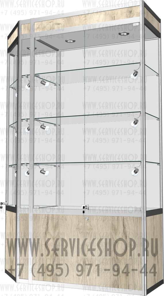 Витрина со скошенным углом и тумбой из алюминиевого профиля серии Старт модель В-23т изготавливается из алюминиевого профиля с вставками из плит МДФ или ЛДСП , стекла 5-6мм с полированными краями. В стандартном исполнении в витрины устанавливают 3 стеклянные полки с возможностью регулировки по высоте, распашные стеклянные дверки ,раздвижные дверки в накопительную подтоварную тумбу, замок для распашных дверей , галогеновая подсветка в верхнем фризе.