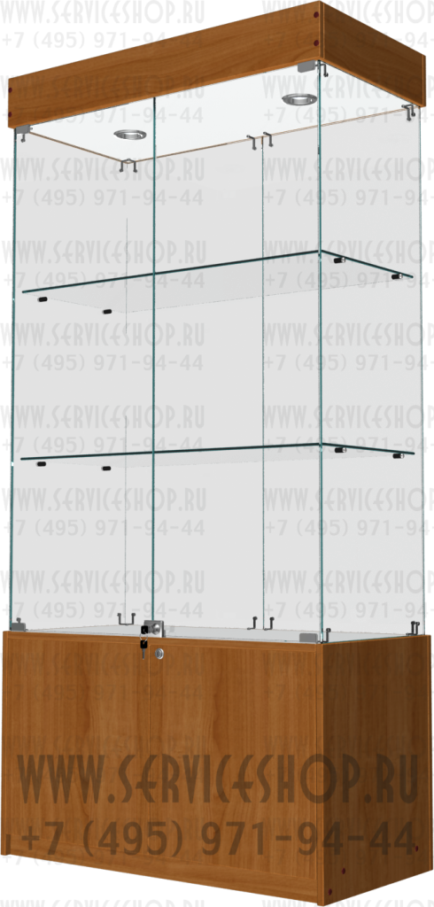 Прямоугольная витрина с тумбой коллекция Аврора модель В-4 изготавливается из стекла марка м-1 толщиной 5мм.с полированными торцами в видимых частях ,крепление стекла на уголках, полки без регулировки. Нижняя и верхняя часть витрины изготавливается плиты ЛДСП. Витрина комплектуется подсветкой (светильниками) которая устанавливается в верхней части