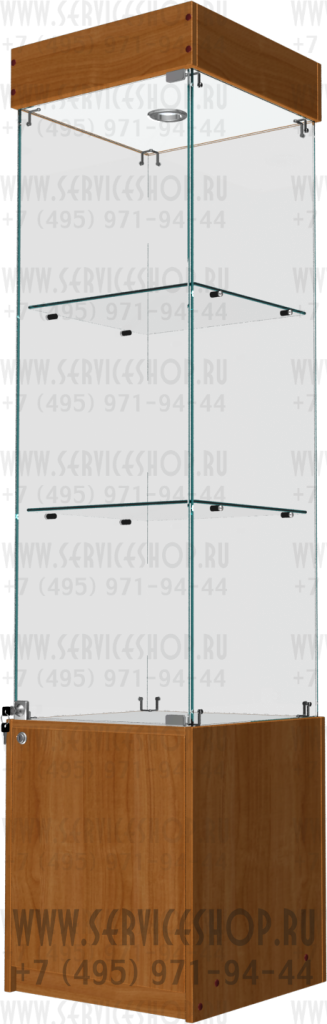 Витрина квадратная с тумбой коллекция Аврора модель В-1 изготавливается из стекла марка м-1 толщиной 5мм.с полированными торцами в видимых частях ,крепление стекла на уголках, полки без регулировки. Нижняя и верхняя часть витрины изготавливается плиты ЛДСП. Витрина комплектуется подсветкой (светильниками) которая устанавливается в верхней части